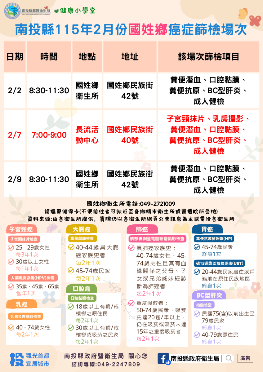 📣南投縣115年2月份成人健檢及癌症篩檢活動快訊📣